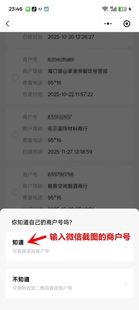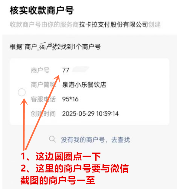 七、点击核实收款商户号,要核对刚才截图的商户号与拉卡拉商户号名称一致,然后点击确认即可,