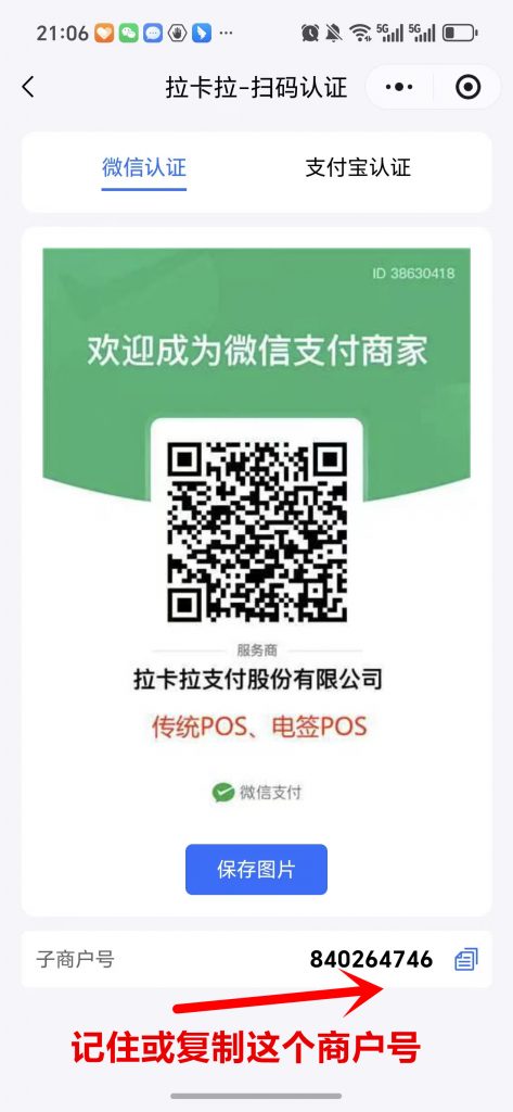 二、使用本人微信扫码拉卡拉背面简菓小程序进入,点击拉卡拉产品,点击【支付认证】,然后会显示【欢迎成为微信支付商家】图片,使用手机截图保存到手机相册,不能直接保存图片。
